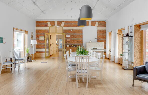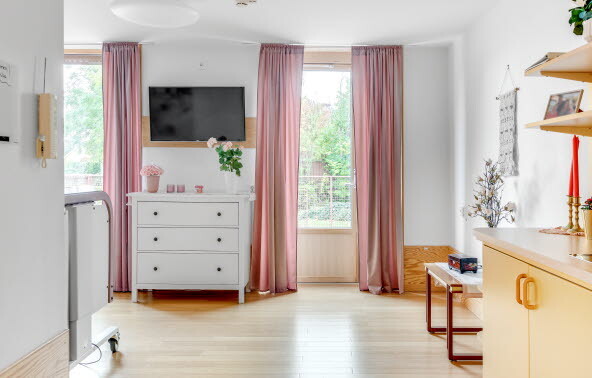 Hos oss har den enskilde möjlighet att själv möblera sitt rum. Vi arbetar med pedagogiska måltider, vilket innebär att personalen normalt äter tillsammans med de boende, men det finns också möjlighet att äta i det egna rummet, i allmänna utrymmen på avdelningen eller vid eget bord.